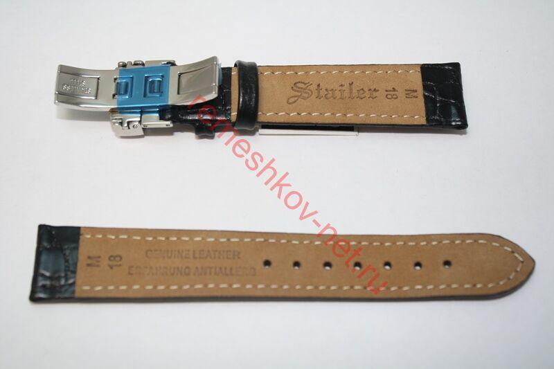 Ширина: 18мм, застежка 16 мм. Длина: М (стандартный) Цвет: Черный. С строчкой. Цвет застёжки: Белая. Клипса раскладывающаяся. Кожа телёнка. Имитация аллигатора.