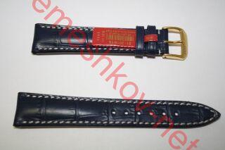 Ширина: 19мм, застежка 16 мм. Длина: М (стандартный) Цвет: Темно-синий. С белой строчкой. Цвет застёжки: Желтая. Имитация аллигатора. Ремешок выполнен из натуральной кожи телёнка.