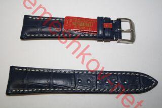 Ширина: 22мм, застежка 18 мм. Длина: М (стандартный) Цвет: Темно-синий. С белой строчкой. Цвет застёжки: Белая. Имитация аллигатора. Ремешок выполнен из натуральной кожи телёнка. А также в наличии размеры: L (удлинённый),и XL (длинный).
